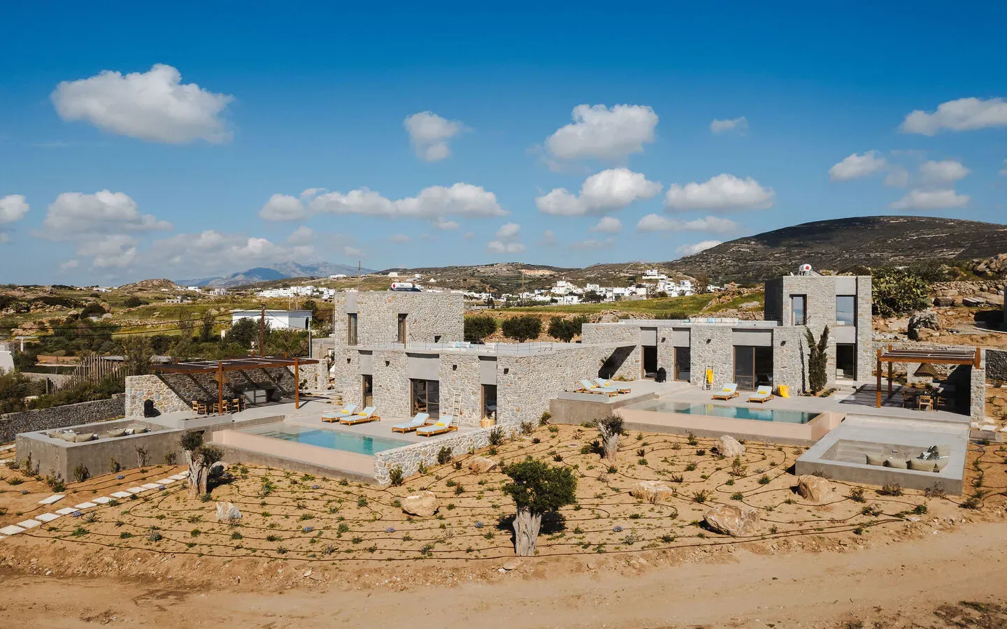 Villa 1 at Theros Villas Naxos is a 150 sqm luxury sanctuary with three beautifully appointed bedrooms, a private pool and Jacuzzi, and smart home features for up to six guests seeking island elegance and comfort.