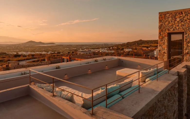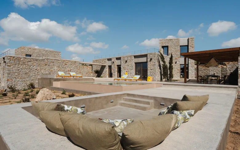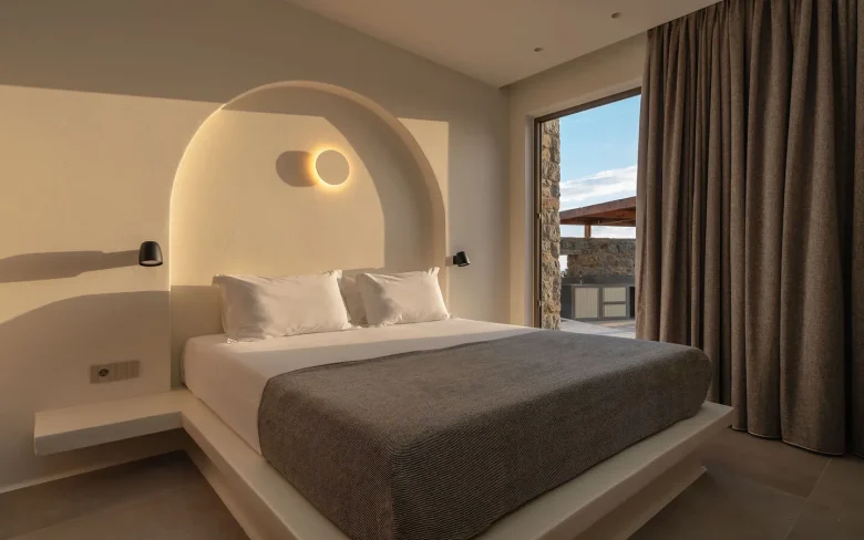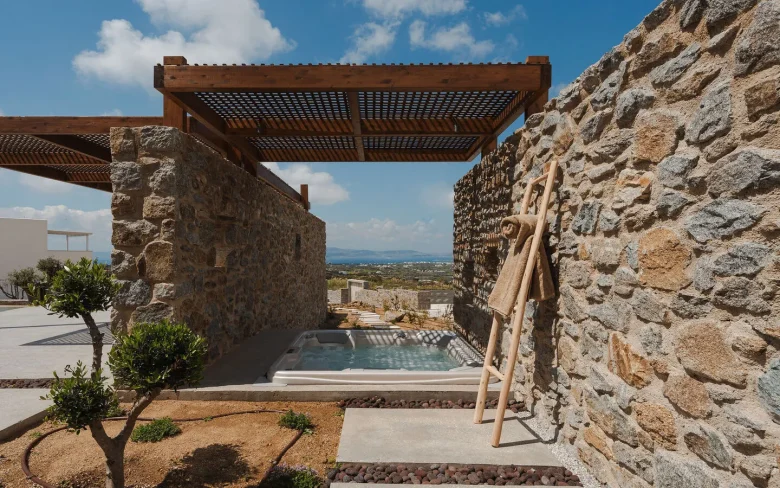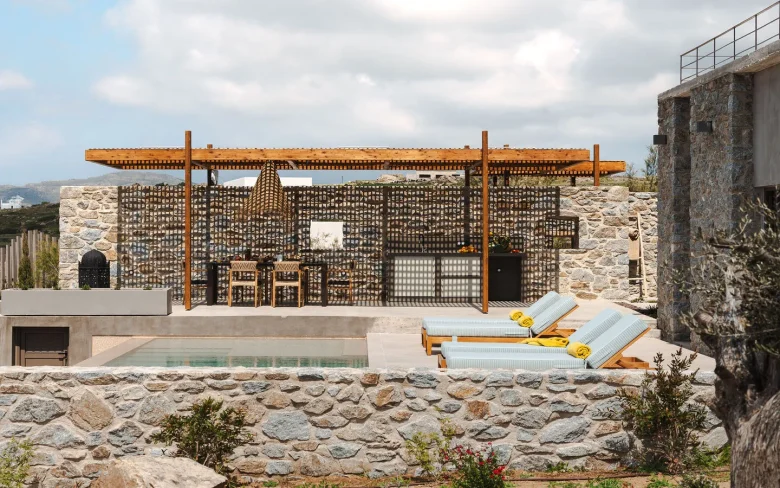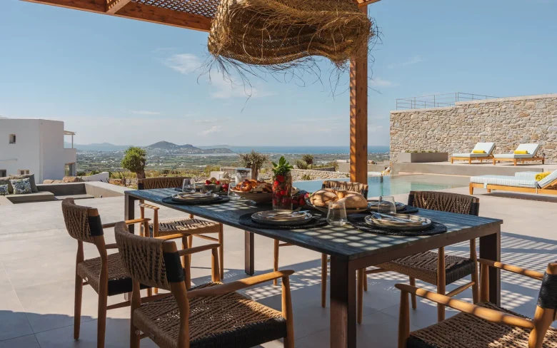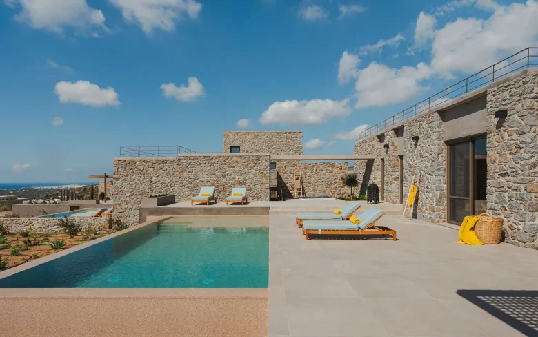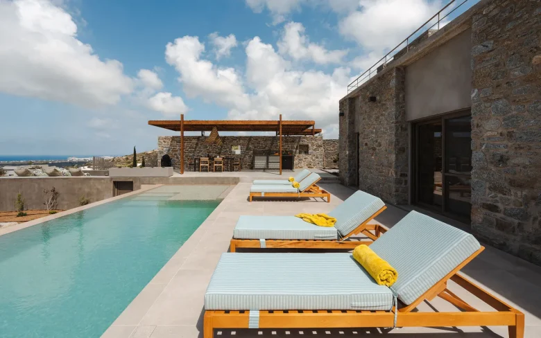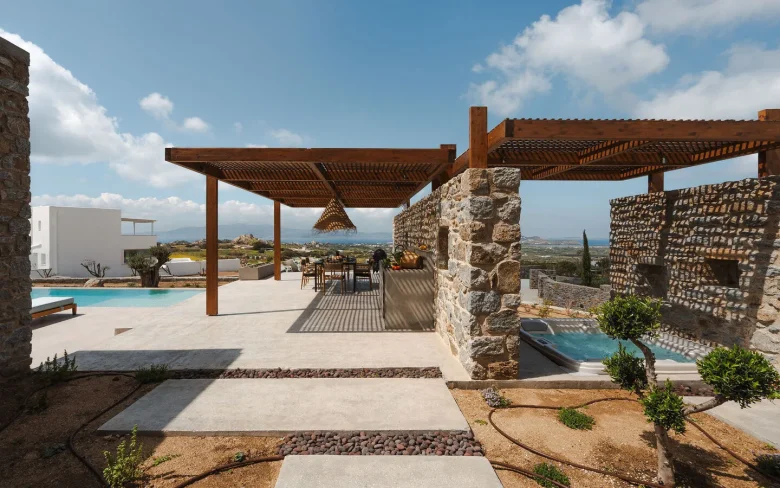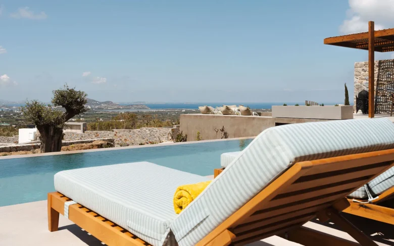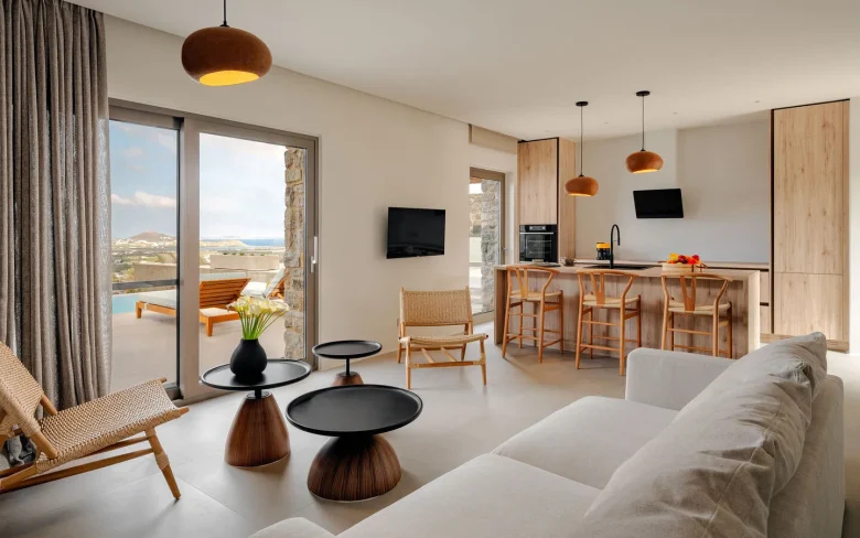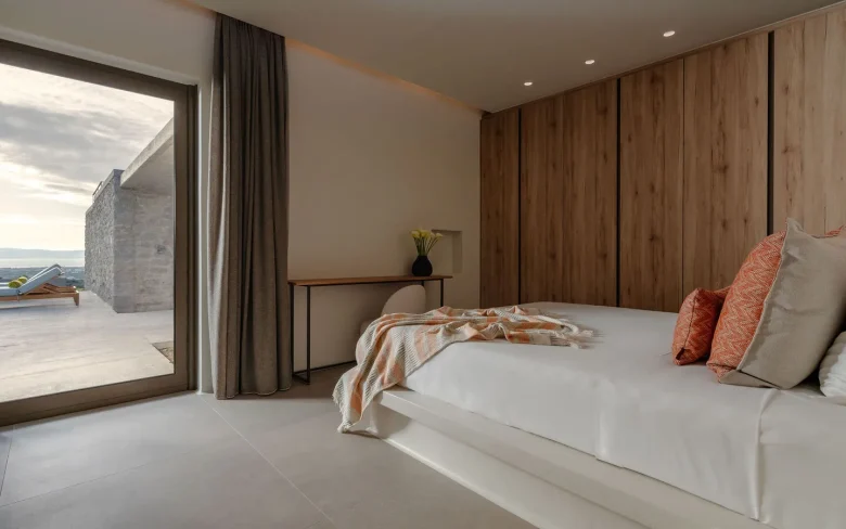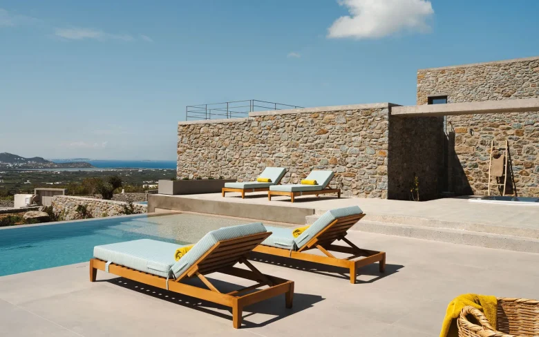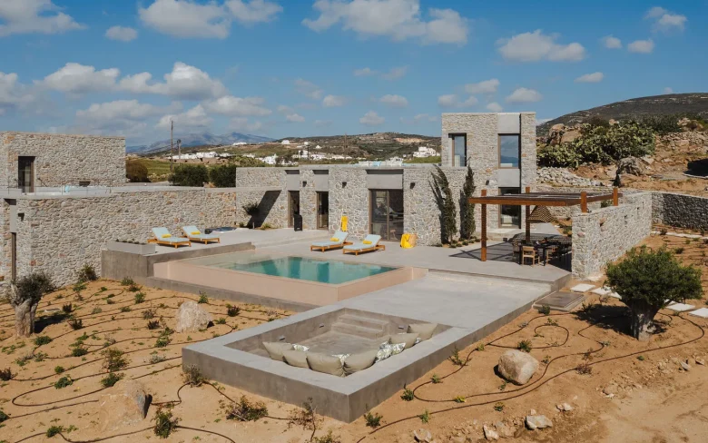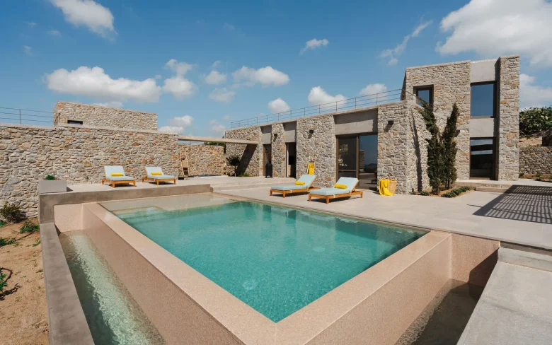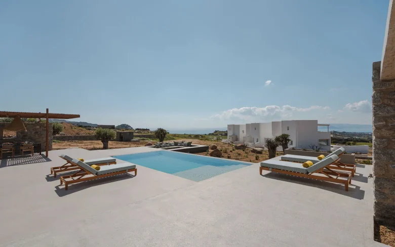 Villa 1 at Theros Villas Naxos is a 150 sqm luxury sanctuary with three beautifully appointed bedrooms, a private pool and Jacuzzi, and smart home features for up to six guests seeking island elegance and comfort.