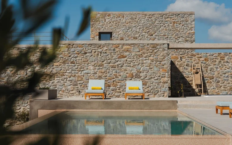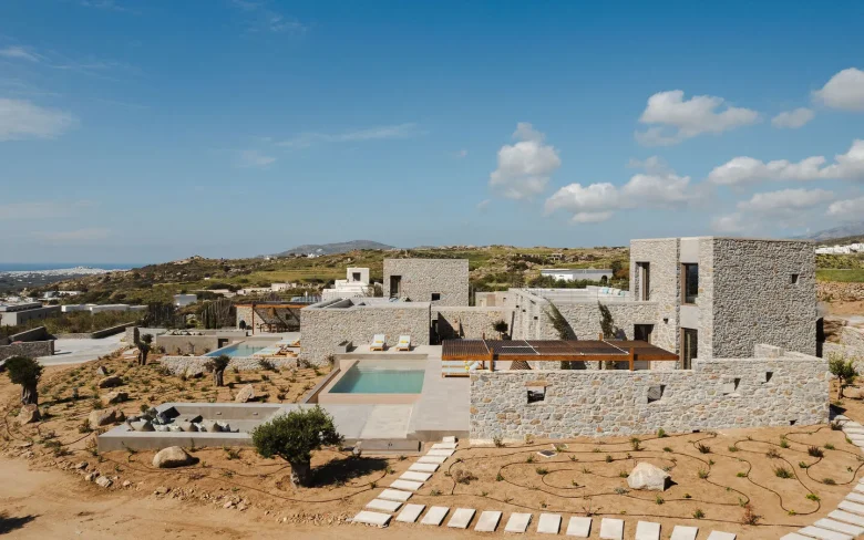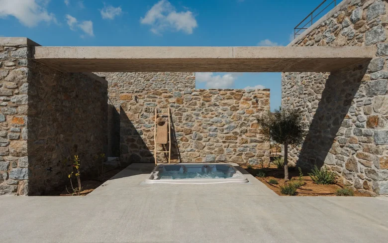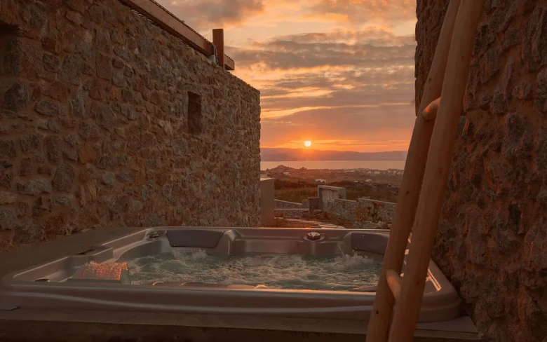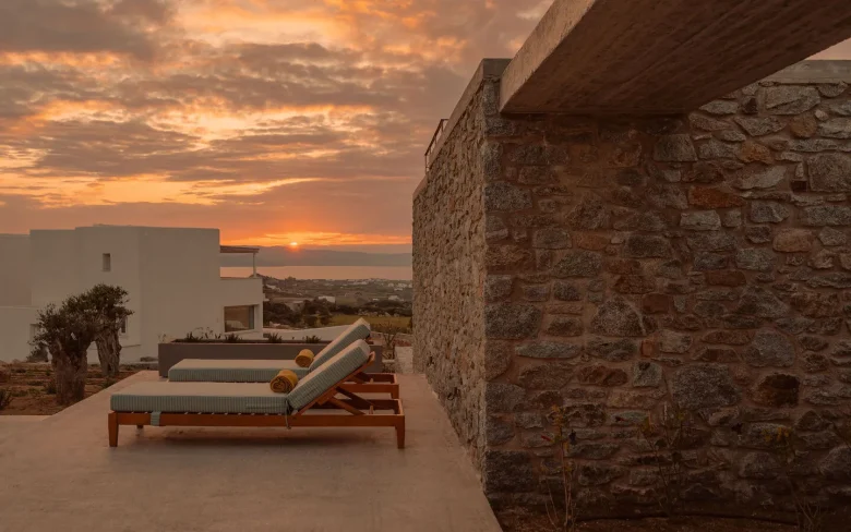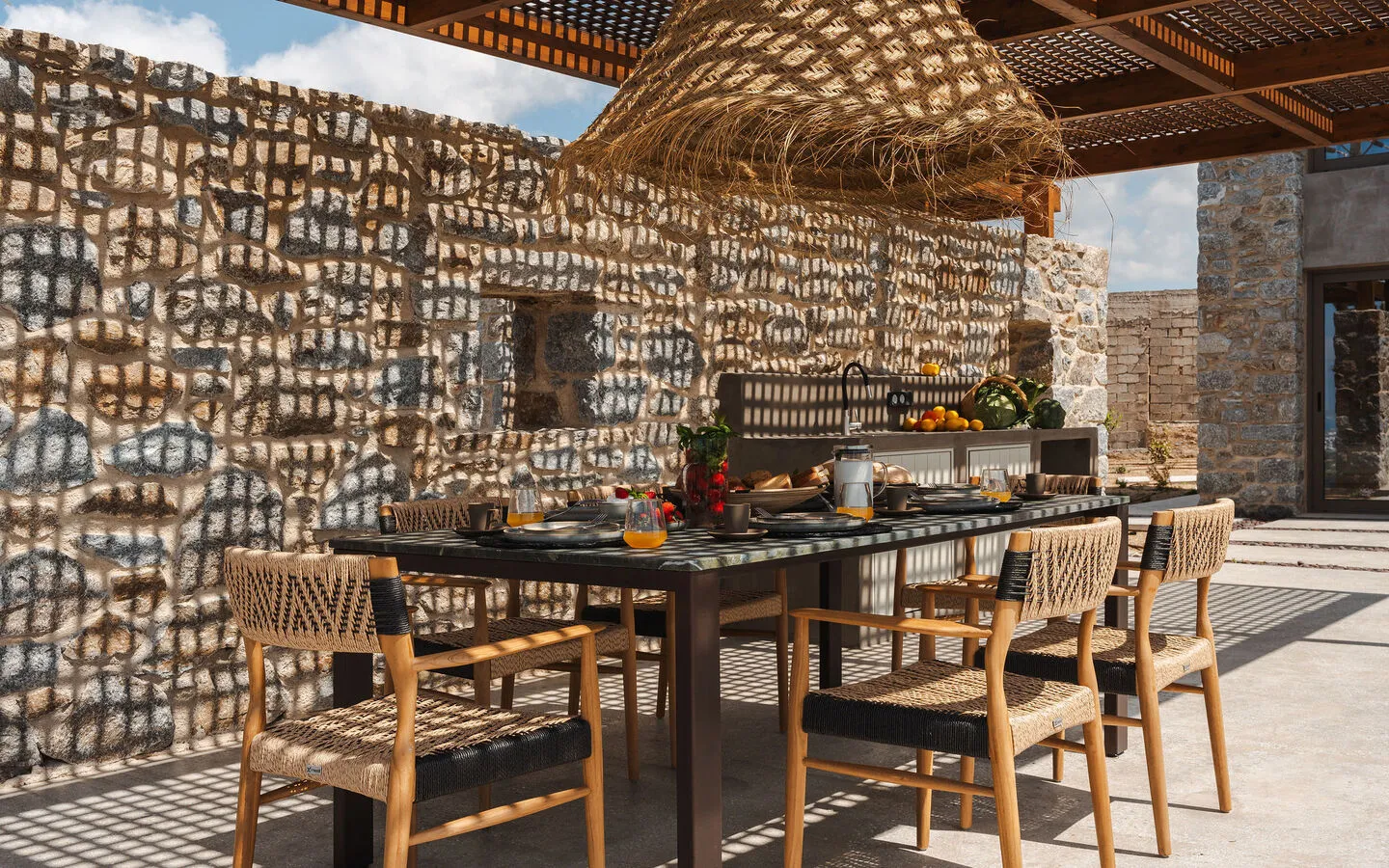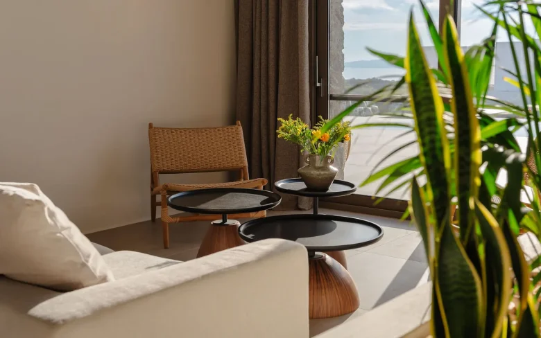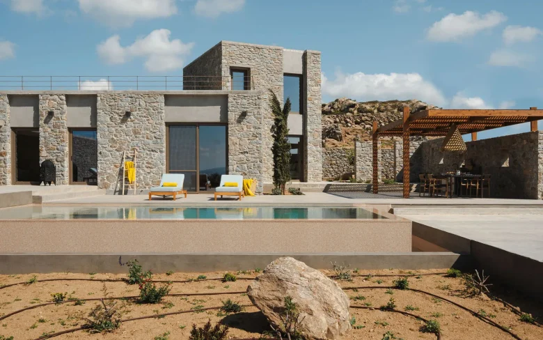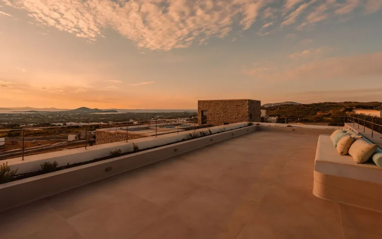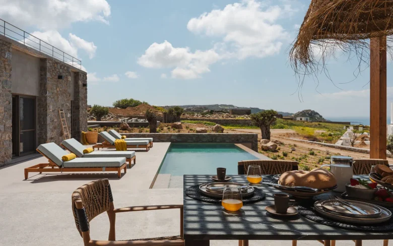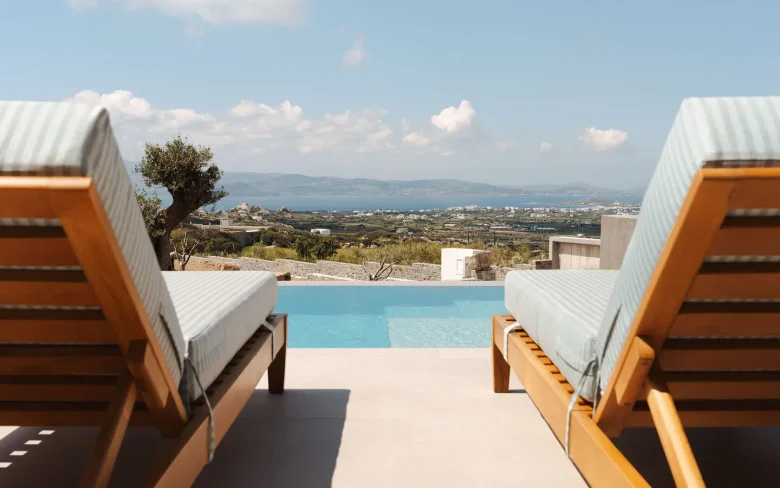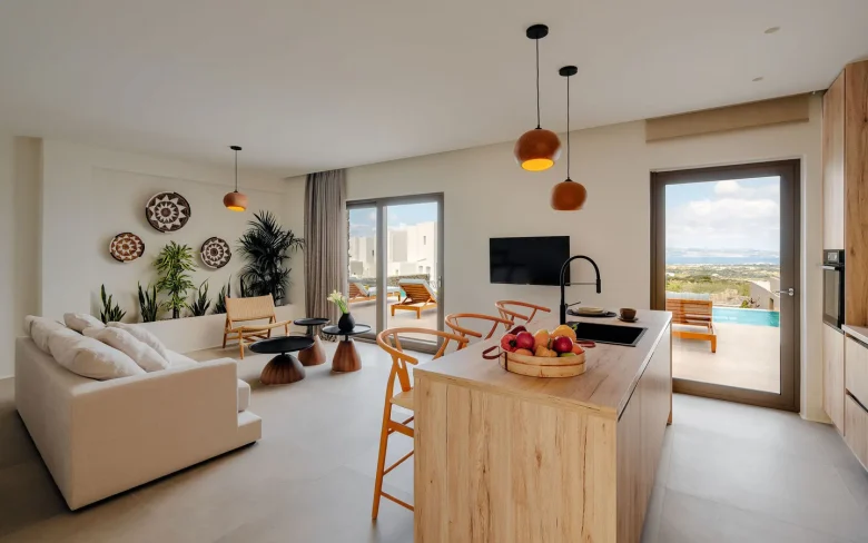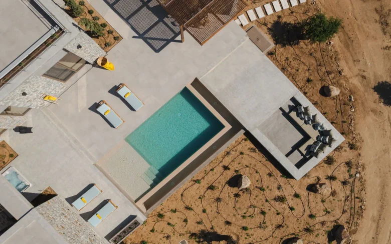 Villa 1 at Theros Villas Naxos is a 150 sqm luxury sanctuary with three beautifully appointed bedrooms, a private pool and Jacuzzi, and smart home features for up to six guests seeking island elegance and comfort.