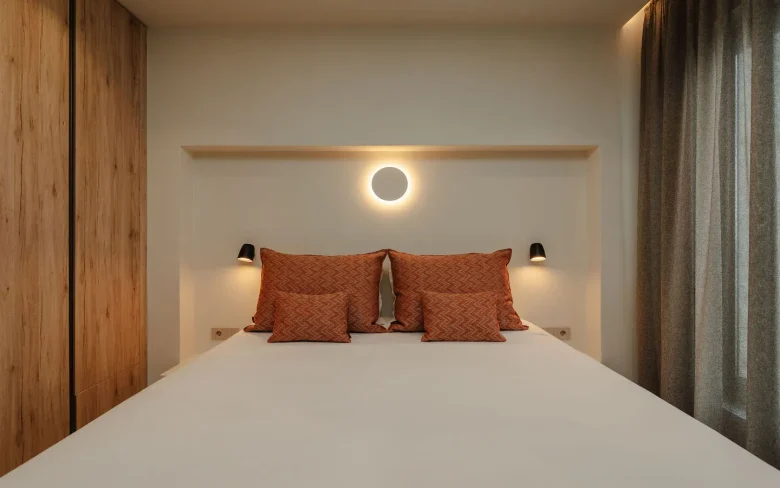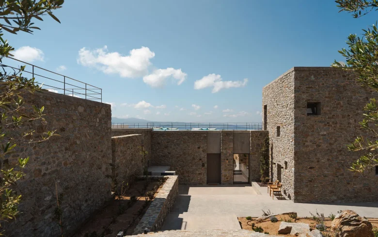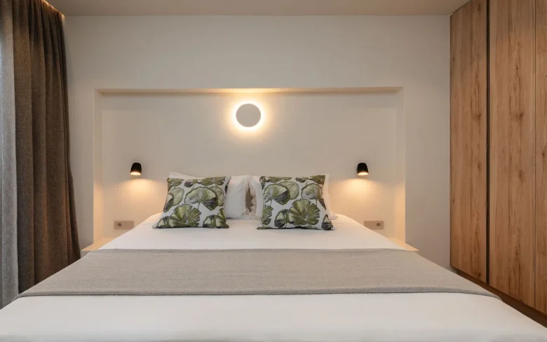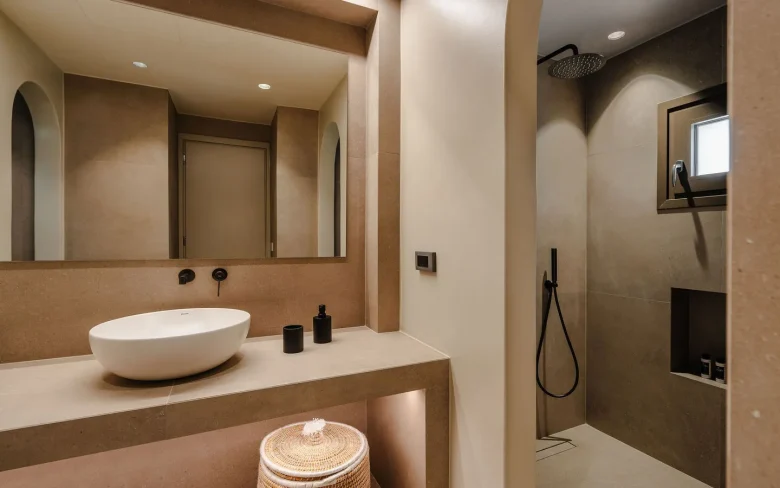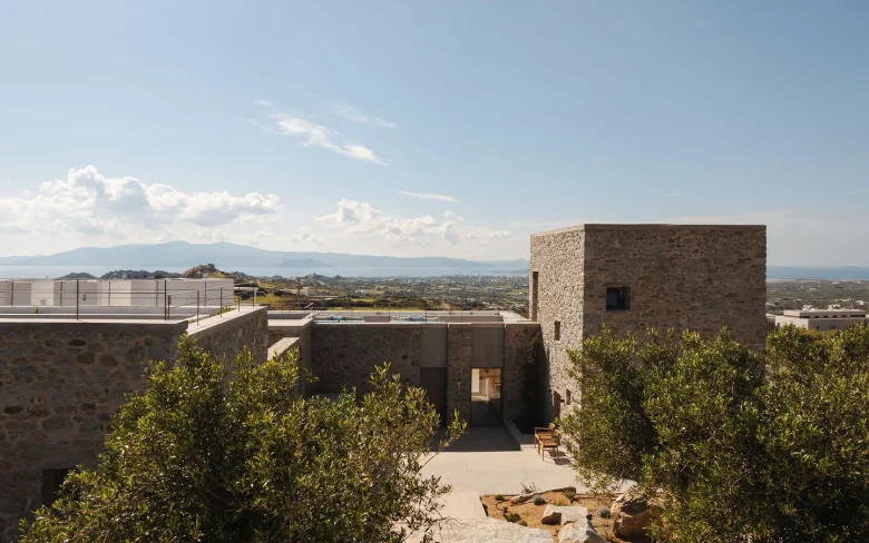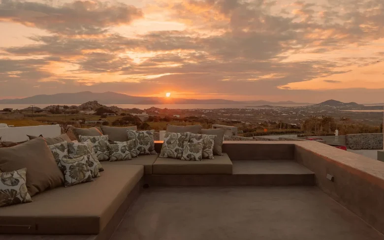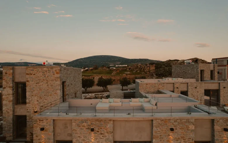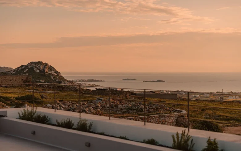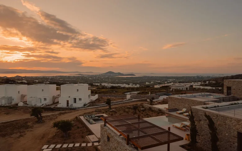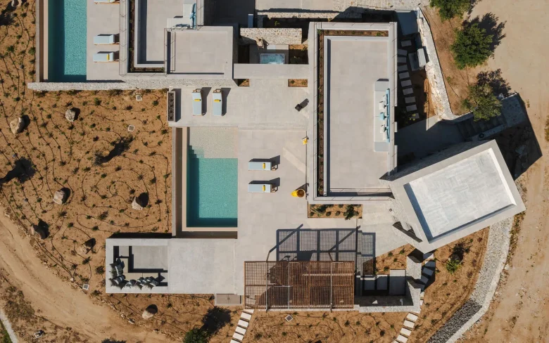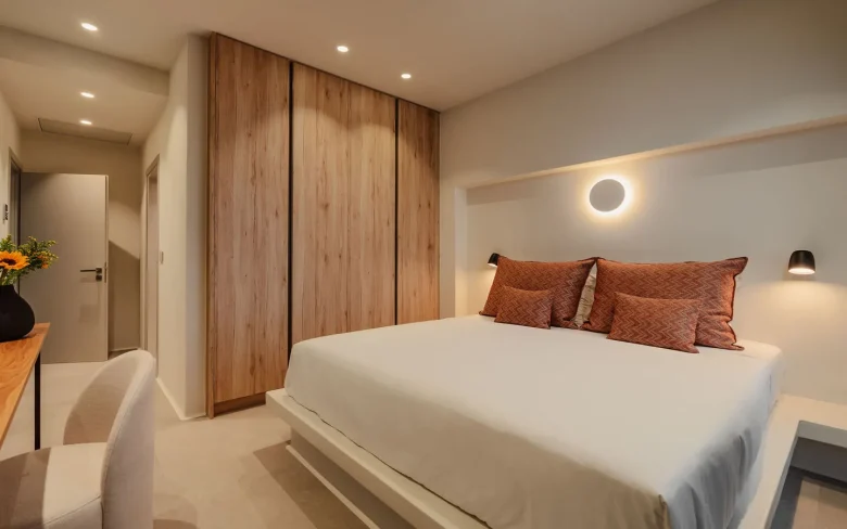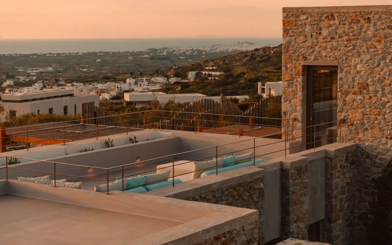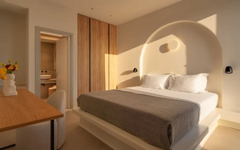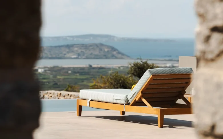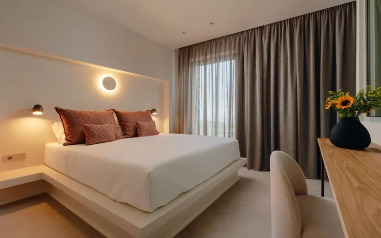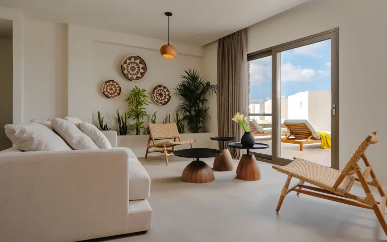 Villa 1 at Theros Villas Naxos is a 150 sqm luxury sanctuary with three beautifully appointed bedrooms, a private pool and Jacuzzi, and smart home features for up to six guests seeking island elegance and comfort.